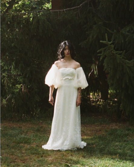 袖にもあしらわれた見事なレース+ベルスリーブが大変美しいシルエットなので、ぜひ試着して体感してほしい一着です。