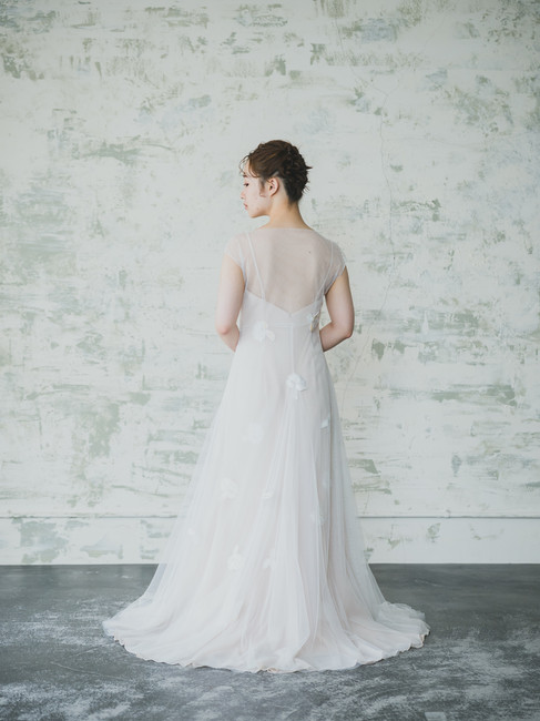 バックデザインは軽やかなチュールを纏い、後ろ姿まで印象的に演出してくれます。
